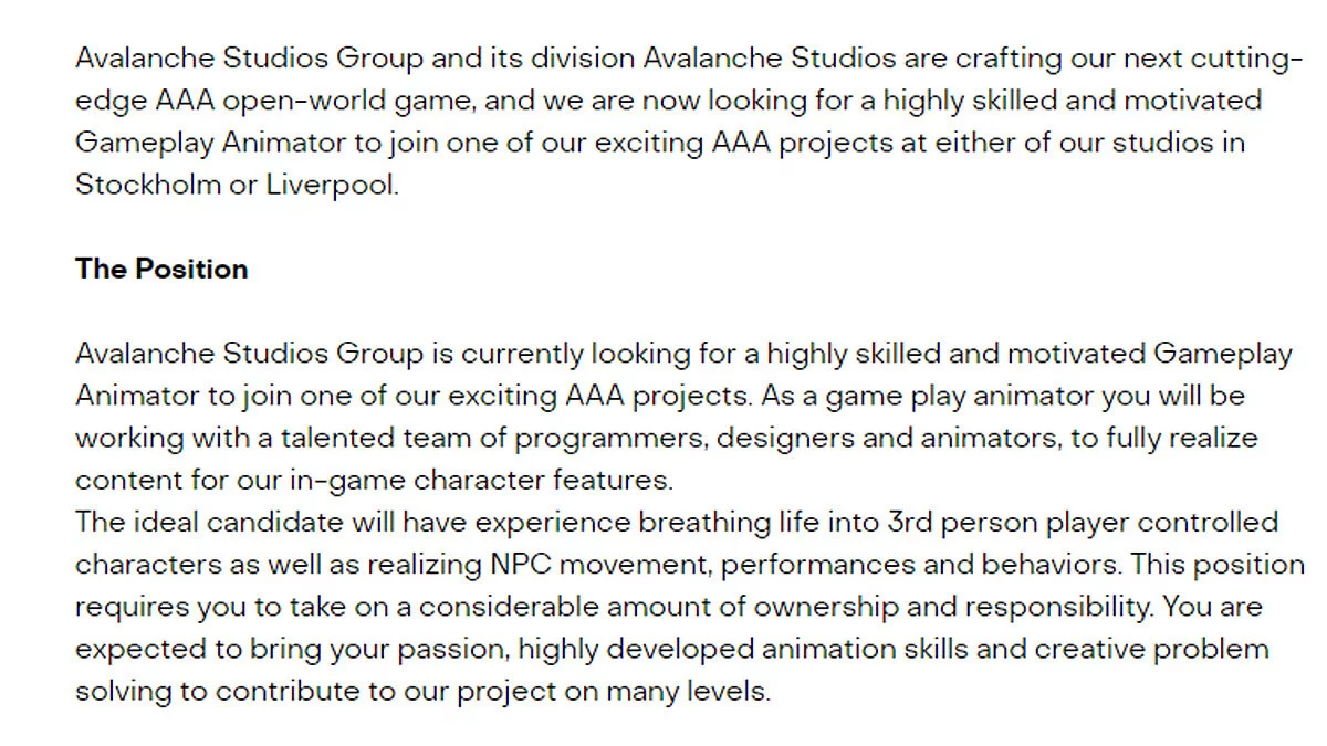 Avalanche Studios Group, выпустившая такие игры как Just Cause, Rage 2 и Mad Max, работает над неназванной ААА-игрой с открытым миром. Информация стала известна благодаря списку вакансий.