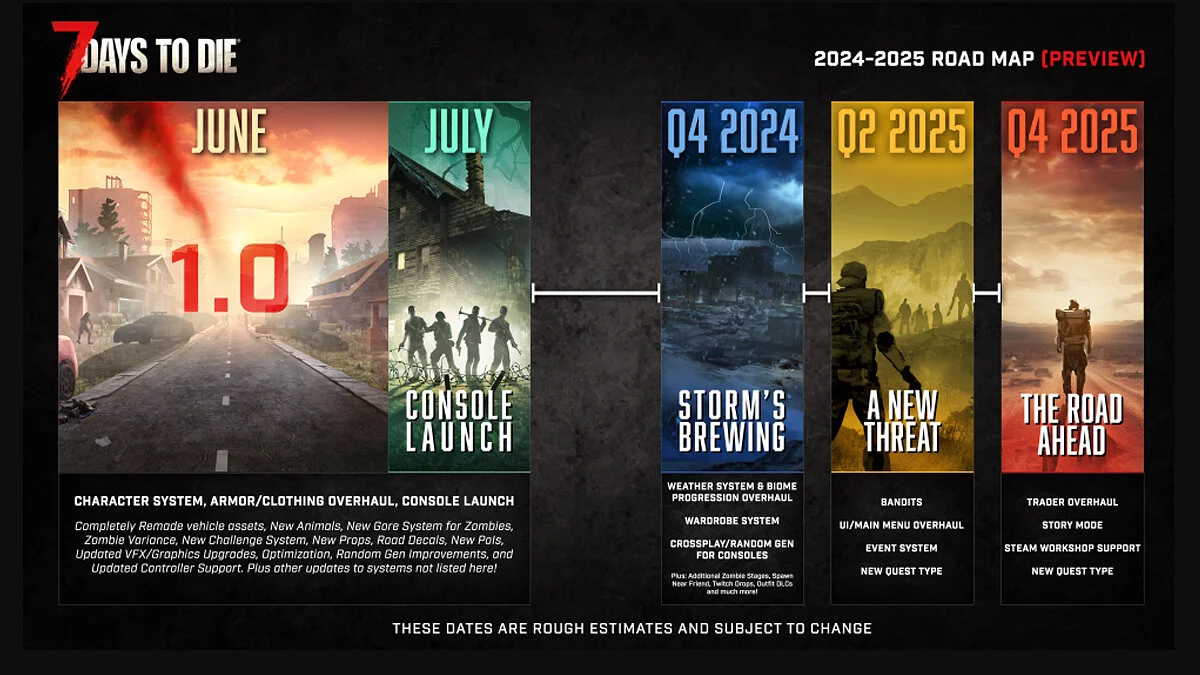 Создатели также представили дорожную карту проекта — судя по ней, одно из дополнений запланировано на последний квартал этого года, и еще два выйдут в 2025 году. Они добавят систему смены погоды и изменения биомов, кроссплатформенность, ивенты, бандитов в открытом мире и новые квесты.
