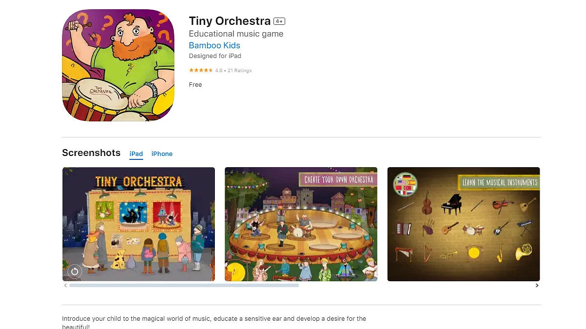 - Tiny Orchestra — обучающая игра, в которой можно создать собственный уникальный оркестр, собрав звучание всех музыкальных инструментов (загрузить бесплатно).