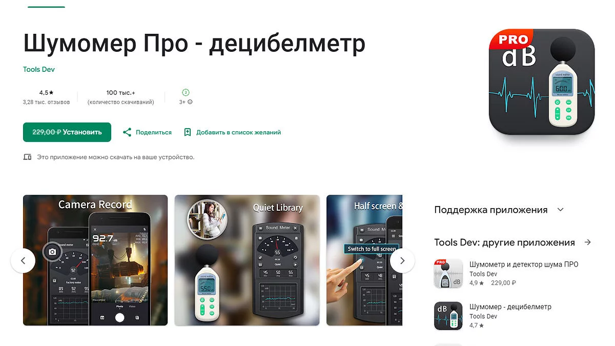 - Шумомер Про — с помощью этого приложения вы можете легко измерить текущий уровень шума окружающей среды (загрузить бесплатно).