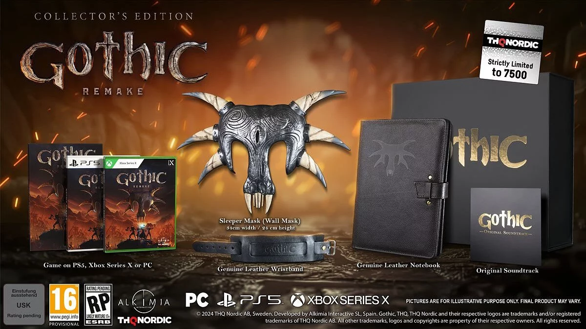 Вместе с копией игры в состав «коллекционки» войдут: настенная маска Спящего, кожаный браслет с логотипом игры, записная книжка в кожаной обложке и саундтрек. Издание выпустят ограниченным тиражом в 7 500 экземпляров. Заказать Gothic 1 Remake: Collector's Edition можно будет только в магазине THQ Nordic.