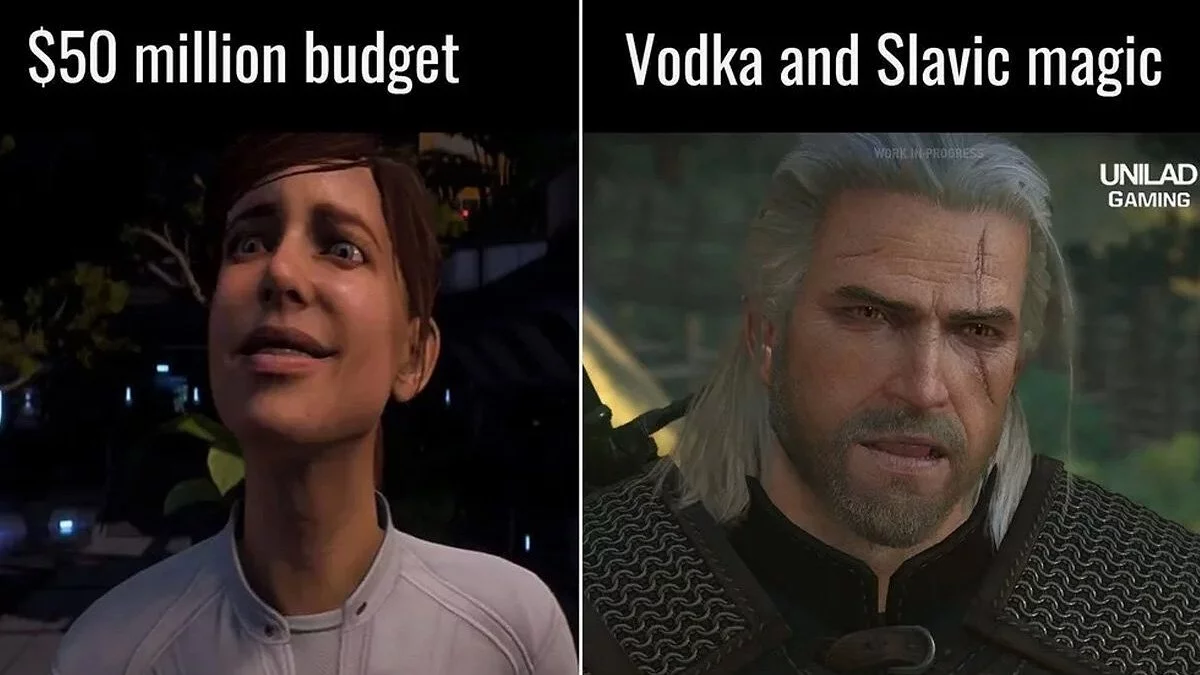 Изображение появилось еще в 2017 году. Его создатель высмеял анимацию лиц в «Андромеде», разместив рядом скриншот с Геральтом из третьего «Ведьмака». Надпись к картинке гласила: «Бюджет 50 миллионов долларов/Водка и славянская магия».