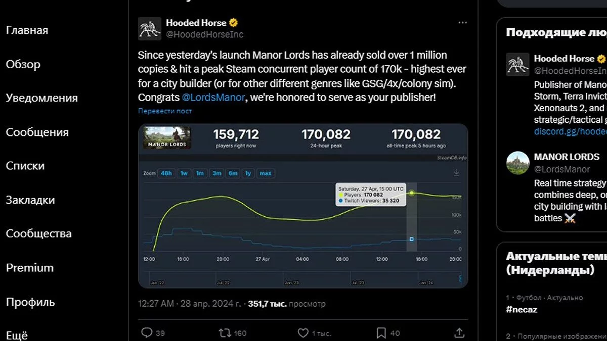 Данными поделился издатель игры Hooded Horse. Он поздравил разработчика Manor Lords с достижением и отметил, что пик онлайна в Steam составил 170 тысяч игроков. Цифра стала рекордной для жанра градостроительных симуляторов.