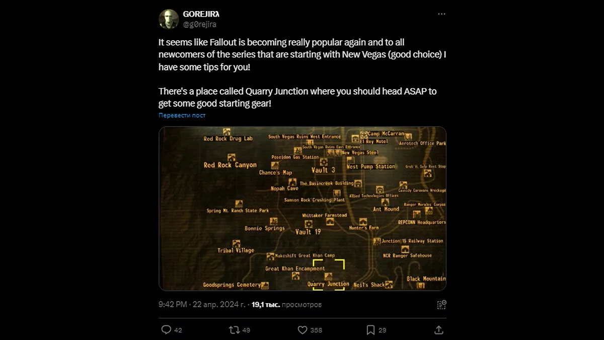 «Есть место под названием Карьер, куда вам следует отправиться как можно скорее, чтобы получить хорошее стартовое снаряжение! — пишет один из ветеранов Fallout: New Vegas под ником g0rejira.