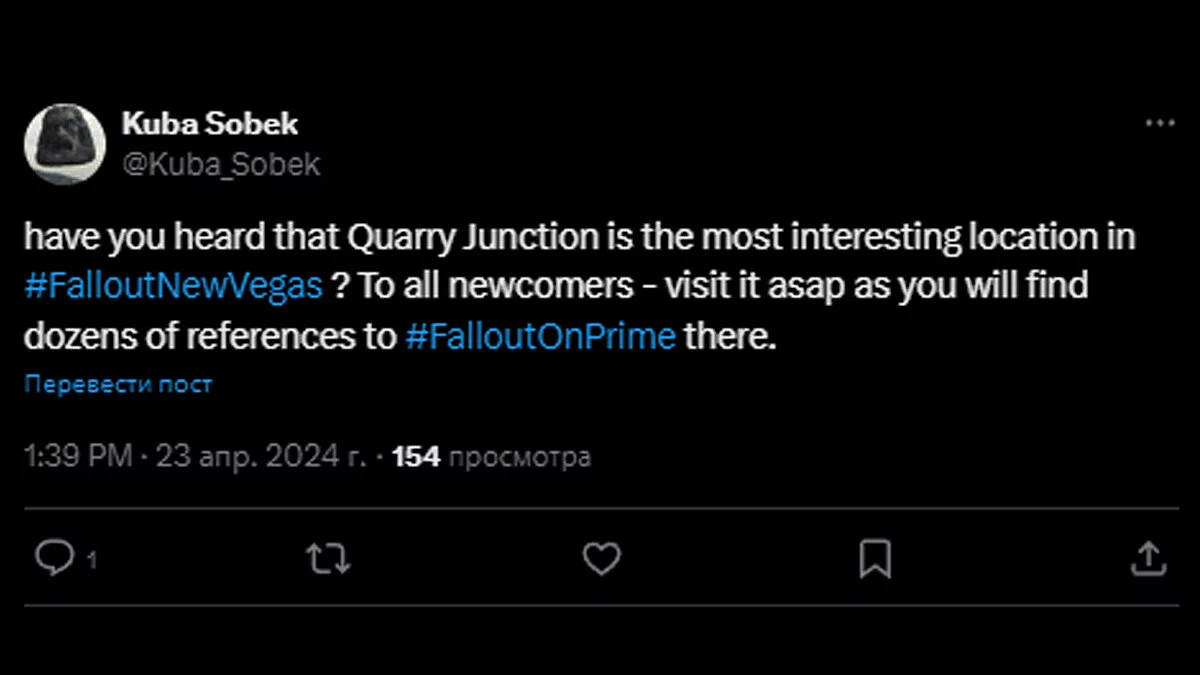 «Вы слышали, что Карьер — самое интересное место в Fallout: New Vegas? Всем новичкам: посетите поскорее, найдете десятки отсылок с сериалу Fallout».