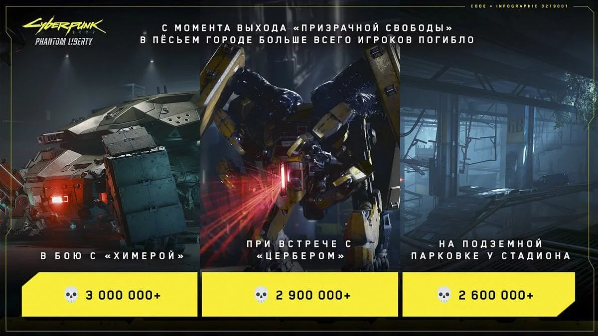 Разработчики Cyberpunk 2077 опубликовали статистику смертей игроков в Phantom Liberty. Если лидерами в списке причин стали «Химера» и «Цербер», то третье место отошло самому неожиданному «противнику» дополнения.