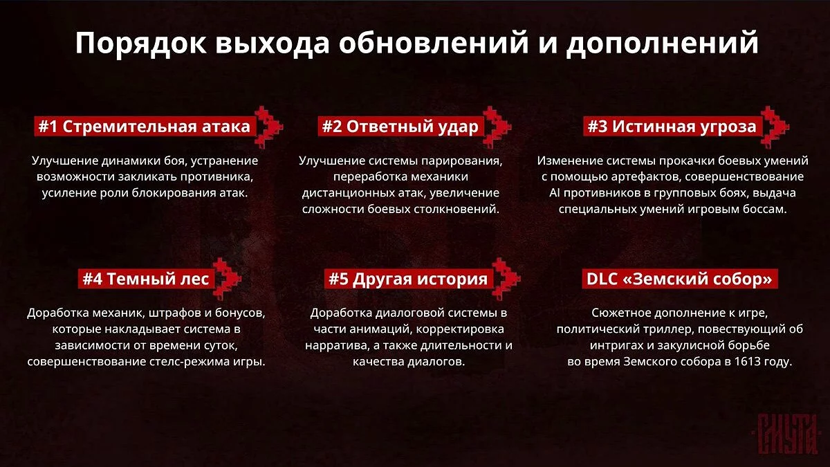 Судя по карте, до выхода аддона «Смута» получит несколько крупных обновлений. Они должны будут исправить боевую систему и прокачку, а также доработать стелс, анимации и диалоги.