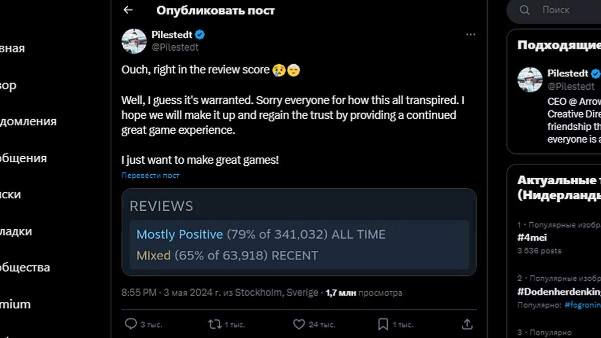 Глава студии Arrowhead Йохан Пилестедт (Johan Pilested) уже отреагировал в соцсетях на волну негодования игроков, заявив, что они могут обратиться в службу поддержки PlayStation. Позже он прокомментировал резко упавший рейтинг Helldivers 2 в Steam, написав следующее: