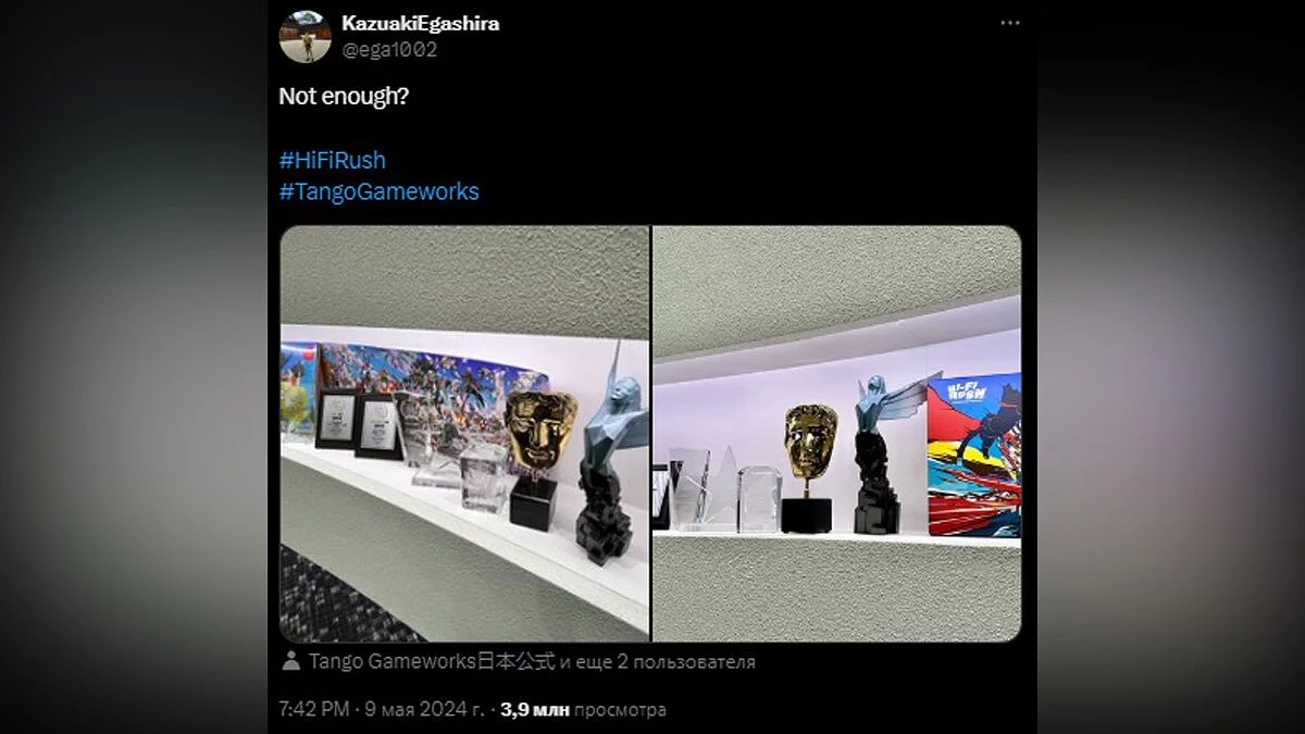 Уже бывший руководитель разработки Кадзуаки Эгашира (Kazuaki Egashira) опубликовал в соцсетях снимок со всеми наградами Hi-Fi Rush, снабдив подписью: «Недостаточно?». Напомним, что небольшой музыкальный слэшер от Tango Gameworks в 2023 году получил сразу несколько престижных премий, включая BAFTA Games, Game Awards и Game Developer's Choice.
