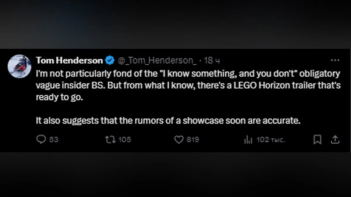 Первый слух появился от Kurakasis, который ранее достоверно сообщил название Marvel 1943: Rise of Hydra. По его словам, обе компании работают над новым проектом, связанным с Horizon. Заявление дополнил более надежный инсайдер Том Хендерсон (Tom Henderson), рассказав о готовящемся трейлере LEGO Horizon. Однако оба пока не знают, о чем именно идет речь.