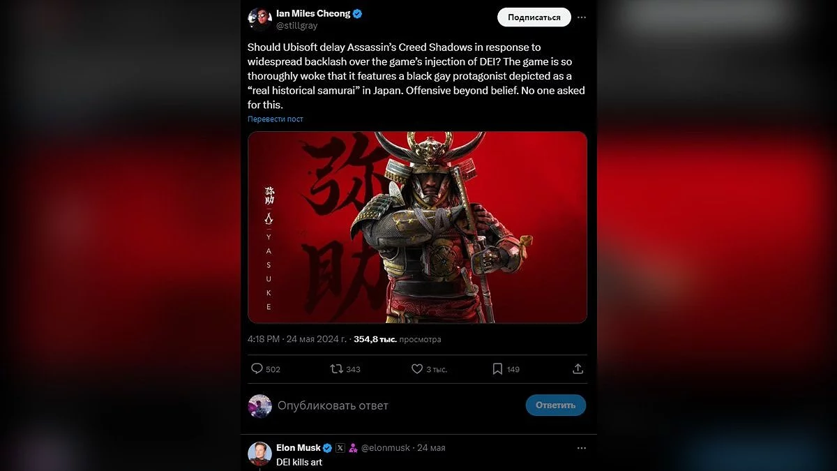 На волне критики в сторону игры пользователь с ником stillgray задался вопросом, «должна ли Ubisoft отложить релиз в ответ на негативную реакцию по поводу внедрения в игру DEI». Напомним, что эта аббревиатура означает концепцию «Разнообразие, равенство и инклюзивность», которой стали руководствоваться многие игровые студии. Далее он затронул присутствие в сеттинге средневековой Японии темнокожего самурая Ясукэ, вокруг историчности которого развернулись многочисленные споры. Масла в огонь подлил тот факт, что недавно Ubisoft намекнула на нетрадиционную ориентацию персонажа.