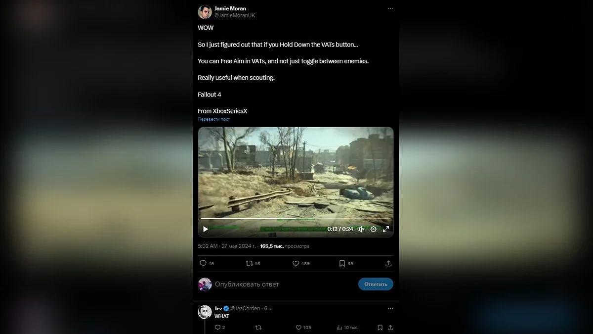 Пользователь с ником JamieMoranUK поделился в соцсетях любопытным открытием, сделанным во время игры в Fallout 4 на Xbox Series X. Оказывается, при удержании кнопки V.A.T.S. можно не только замедлить время и выбрать цель для выстрела, но и свободно осмотреть все пространство вокруг себя.