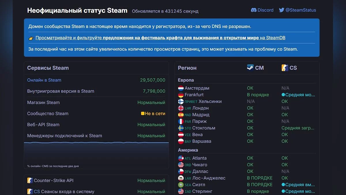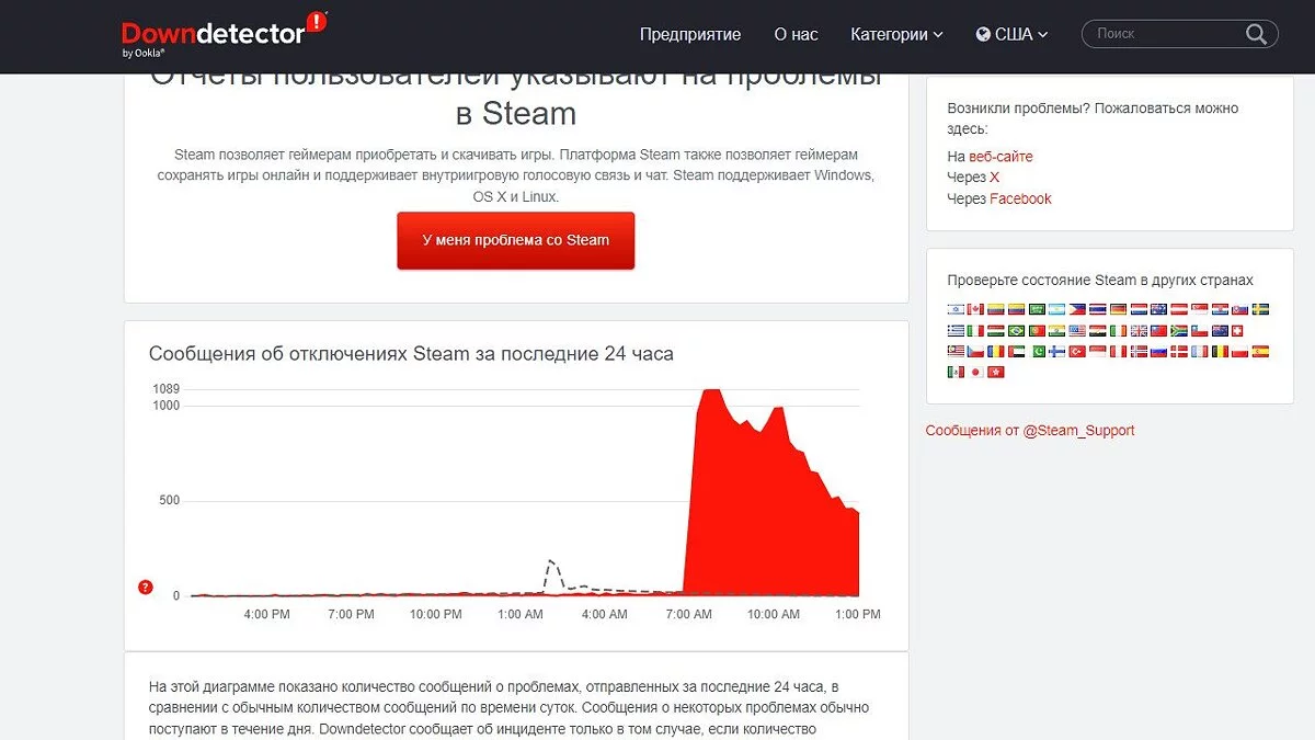 В сервисе Valve по всему миру начался массовый сбой — многие игроки жалуются, что не могут зайти в свой профиль и раздел «Сообщество». Судя по данным Steamstat.us и downdetector.com, раздел «лежит» уже несколько часов. Обновлено: сбой устранен, сервис работает в обычном режиме.