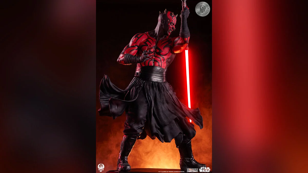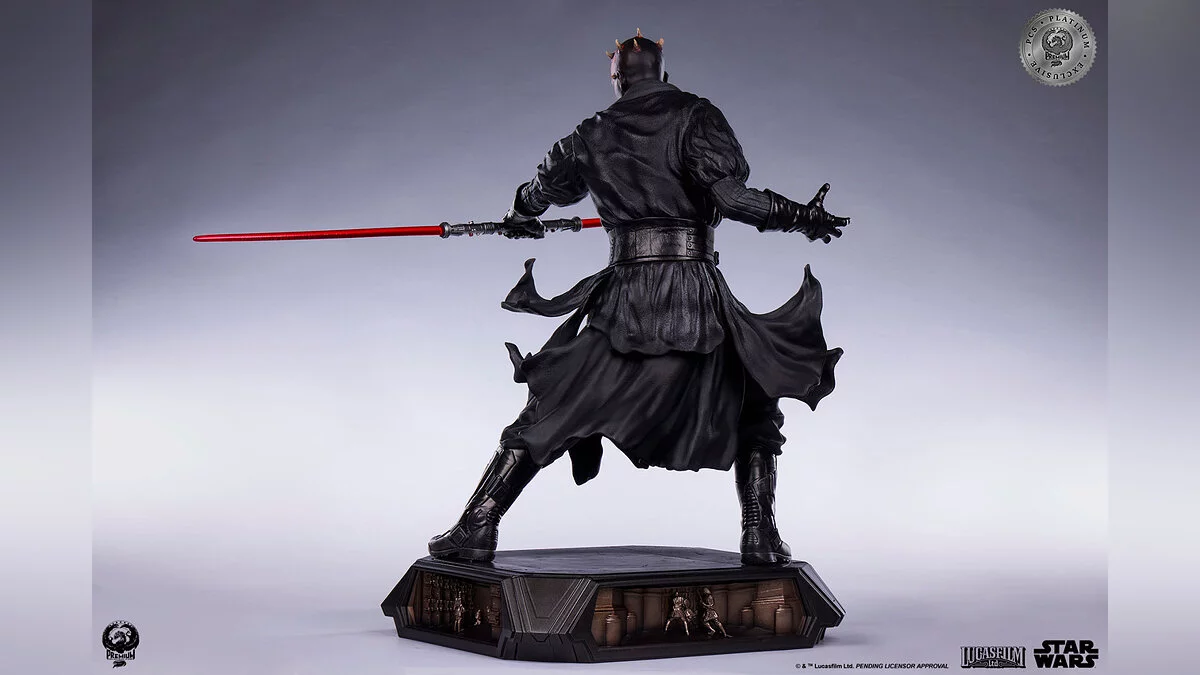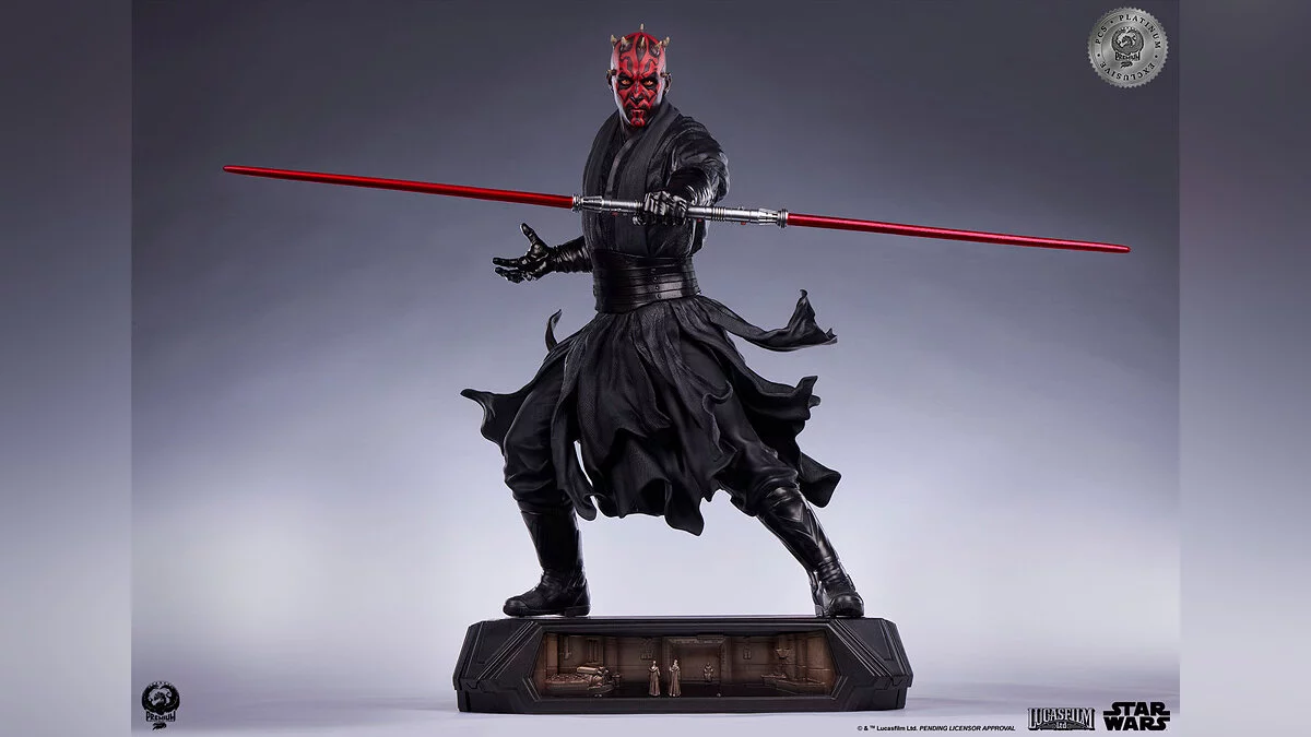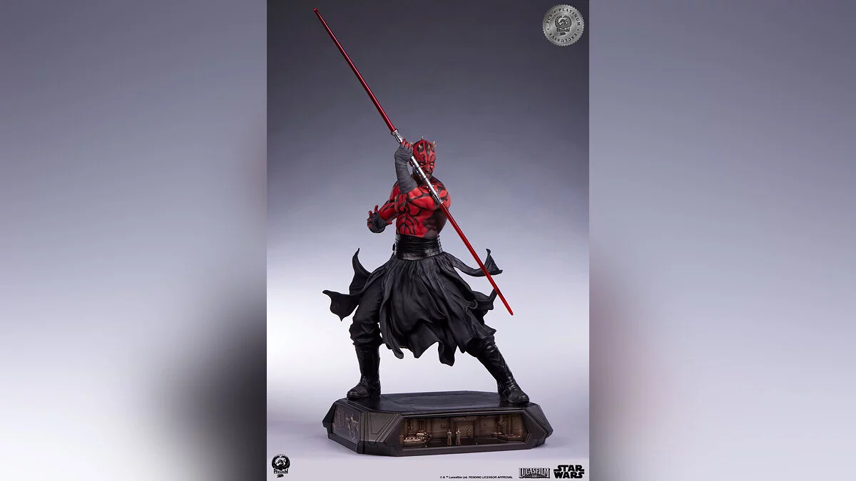 Фигурка выполнена в масштабе 1:3, высота составляет аж 63 сантиметра. Красный световой меч оснащен подсветкой, а на постаменте изображены сцены из поединка между ситхом, Оби-Ваном и Квай-Гоном.