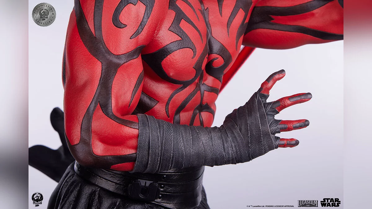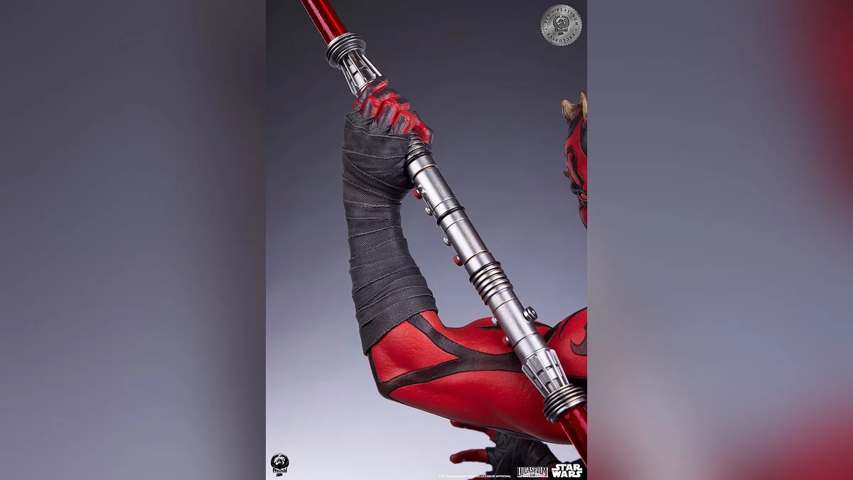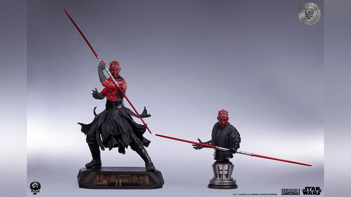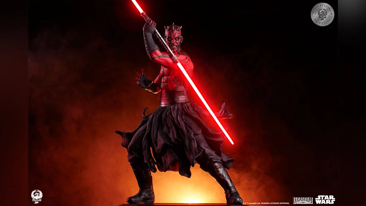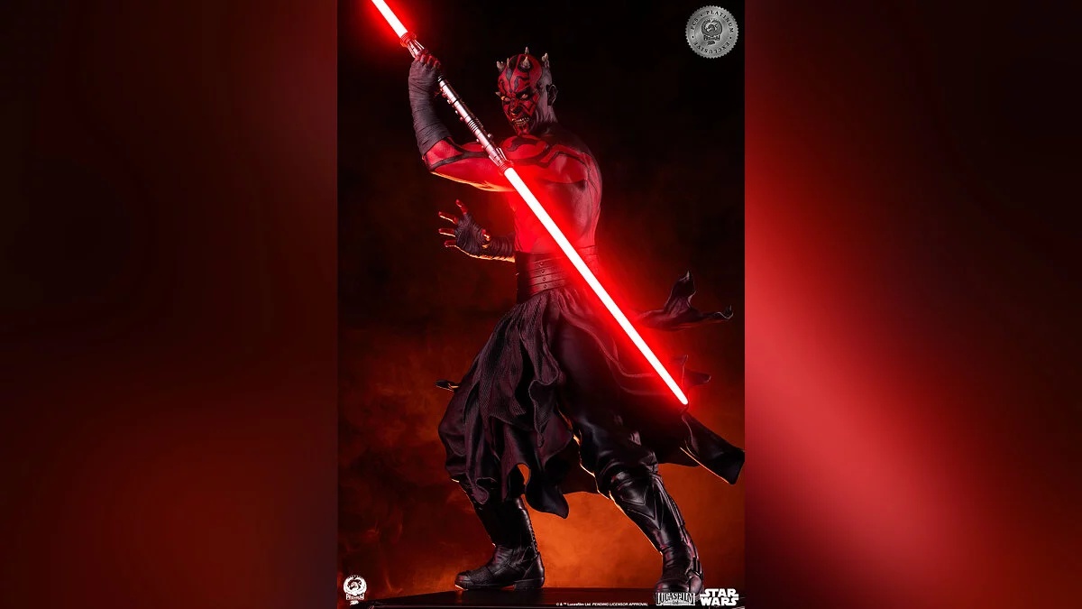 Фигурка выполнена в масштабе 1:3, высота составляет аж 63 сантиметра. Красный световой меч оснащен подсветкой, а на постаменте изображены сцены из поединка между ситхом, Оби-Ваном и Квай-Гоном.
