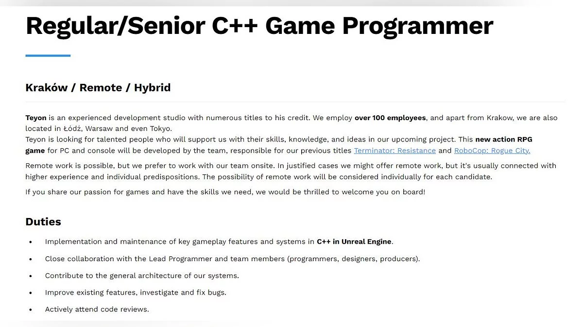 Польская студия Teyon, известная по Terminator: Resistance и RoboCop: Rogue City, уже начала работу над новым проектом, который представляет собой RPG. Об этом стало известно благодаря опубликованной на официальном сайте вакансии на должность программиста C++.
