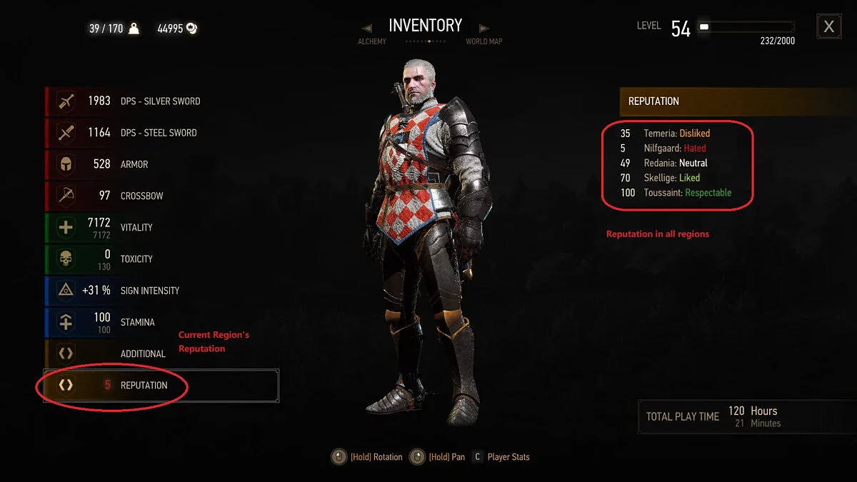 С установкой аддона Геральт действительно начнет получать штрафы в разных регионах за выбор в тех или иных квестах и свои действия. Симпатия измеряется по стобалльной шкале, разбитой на пять уровней от «Ненависти» до «Уважения». Отношение мира к поступкам героя будет сказываться на экономике: при низком уровне Геральт не сможет выторговать побольше на заказах, а за покупки придется переплачивать. С максимальным уважением наоборот: цены станут выгоднее на 30% при покупке и продаже, а максимальная ставка для заказов повысится на 100%.