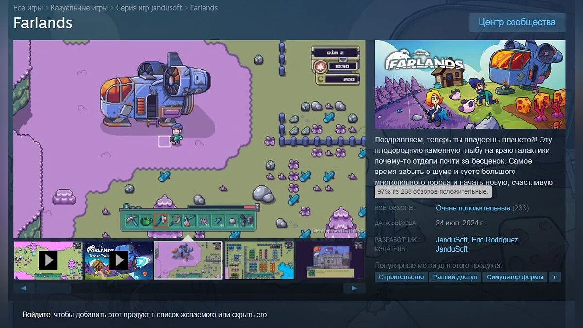 Купить Farlands в Steam можно за 225 pуб с учетом скидки 10% (действует до 7 августа). В 2025 году проект планируют выпустить и на других платформах, включая Nintendo Switch, PlayStation 4, PlayStation 5, Xbox One и Xbox Series X/S.