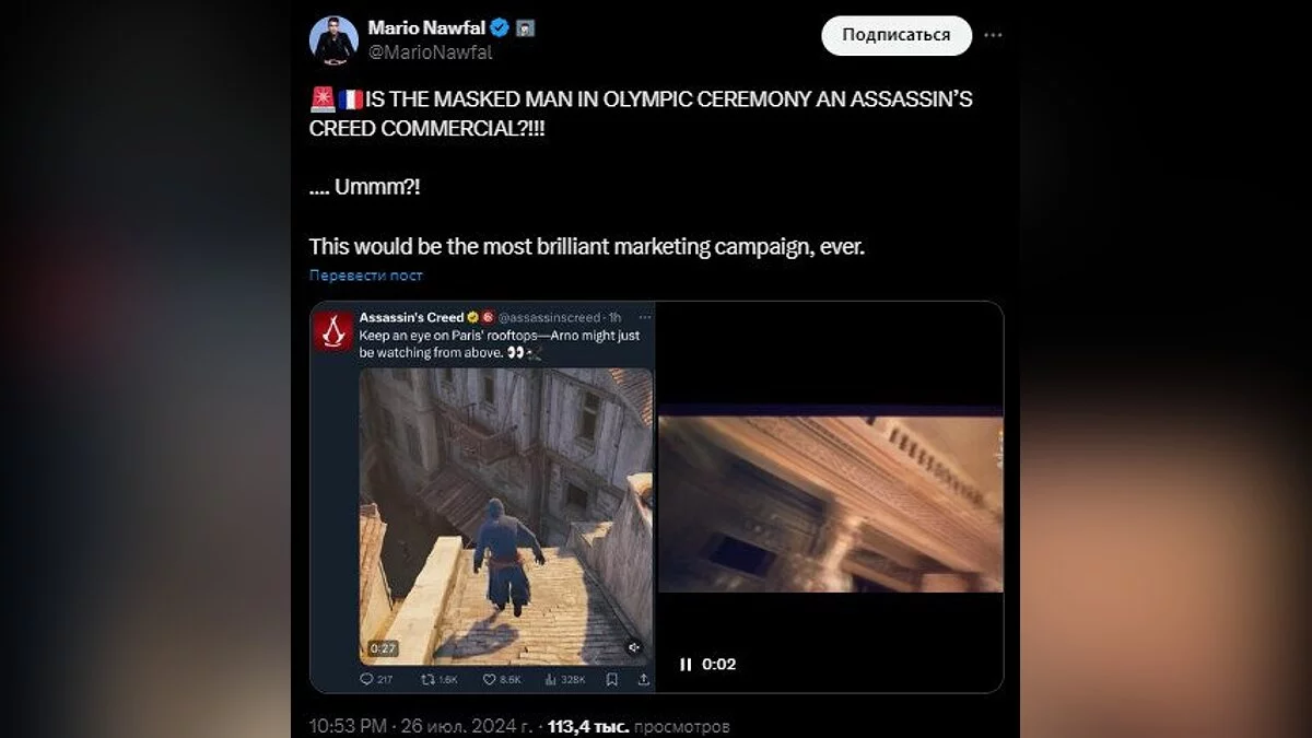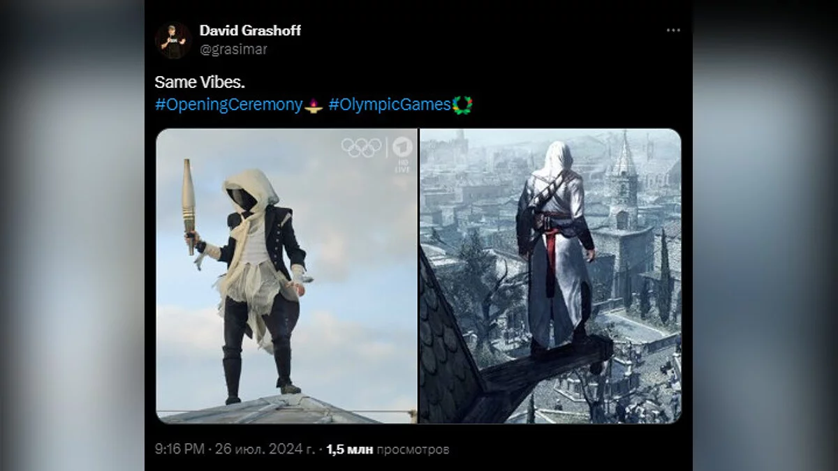 Таинственную фигуру в капюшоне показали во время прямой трансляции открытия. Персонаж стал частью эстафеты олимпийского огня и объектом шума в соцсетях. Многие пользователи быстро опознали в нем ассасина из серии игр Ubisoft.