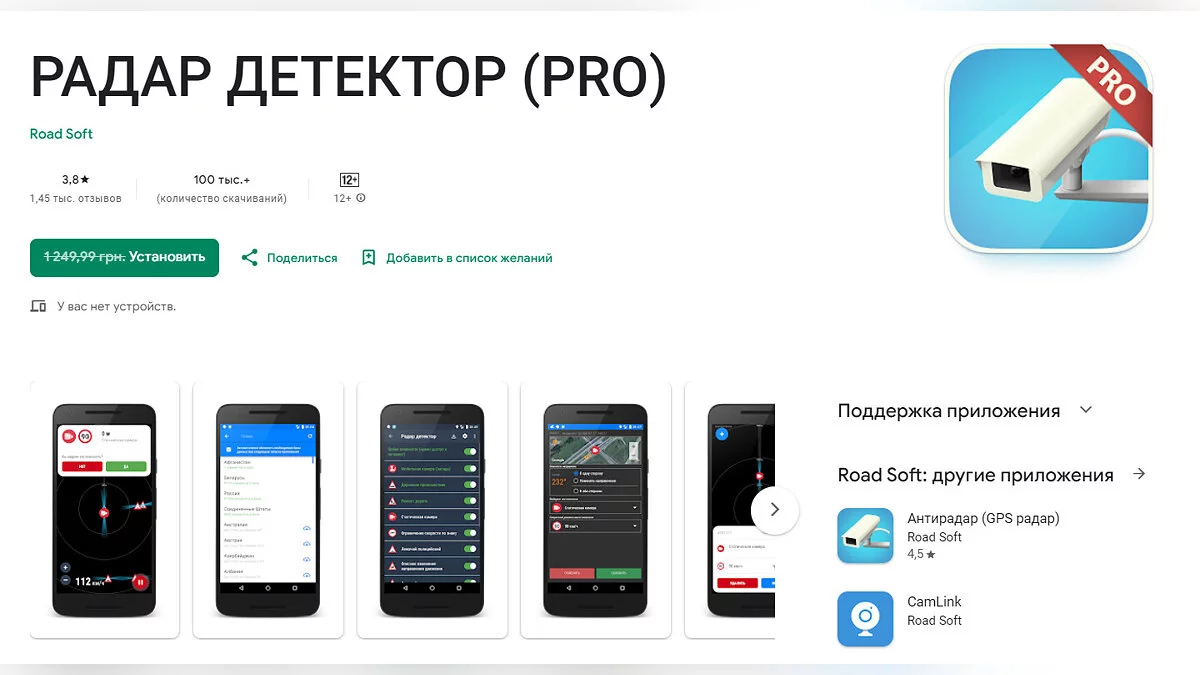 - Speed Camera Radar (PRO) — программа, включающая в себя базы данных камер скорости для разных регионов (загрузить бесплатно);
