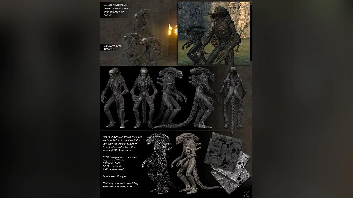 Представленные ниже модели были созданы для Halo 3. В заметках к портфолио разработчик признался, что создал их на движке третьей части в надежде создать прототип кроссовера. По его словам, проработка Чужого заняла около 10 дней, а карту текстур он набросал от руки прямо в Photoshop.