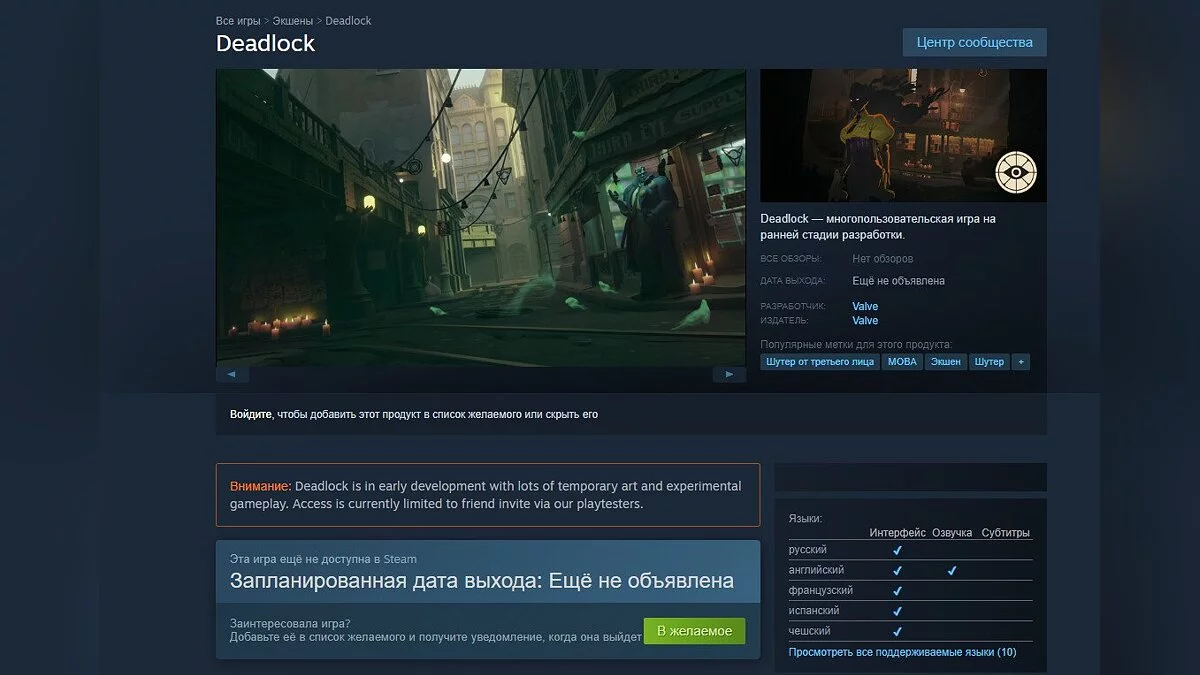 Накануне пользователи SteamDB обратили внимание, что игра наконец-то обзавелась тэгами, а сегодня ночью Valve признала существование шутера, создав страничку в своем магазине. Пока что у проекта весьма скудное описание и нет даже системных требований. В профиле Deadlock указано, что игра «на ранней стадии разработки». Авторы предупреждают, что в текущей сборке пока полно временных графических объектов, игровой процесс еще не отполирован, а локализация не закончена. Сыграть в Deadlock тоже нельзя — доступ к проекту можно получить только по приглашению другого участника.