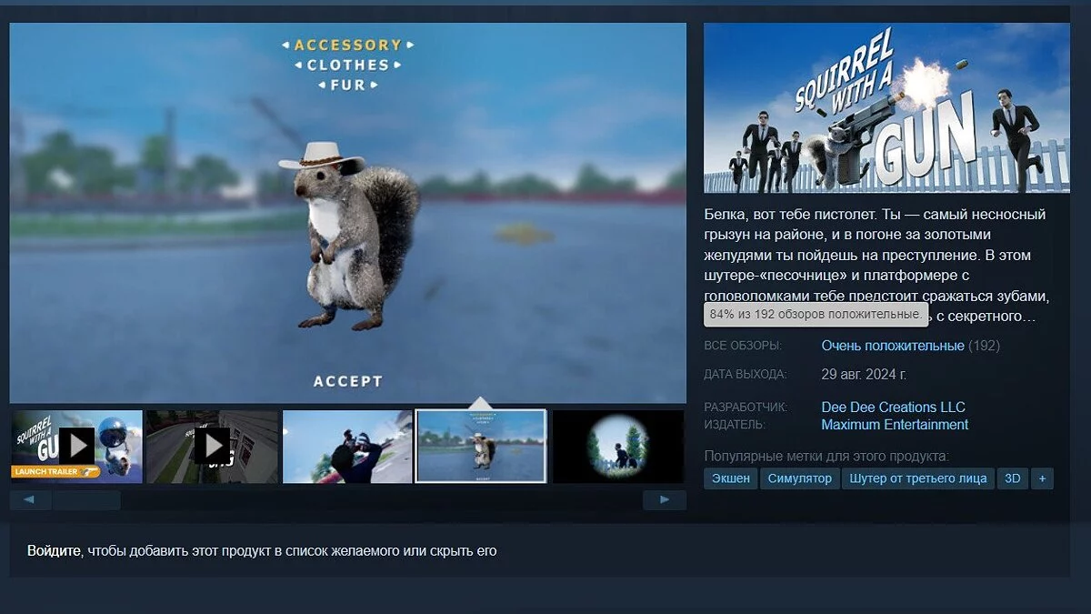 На ПК вышел симулятор белки с пистолетом, который уже получил в Steam очень положительные отзывы