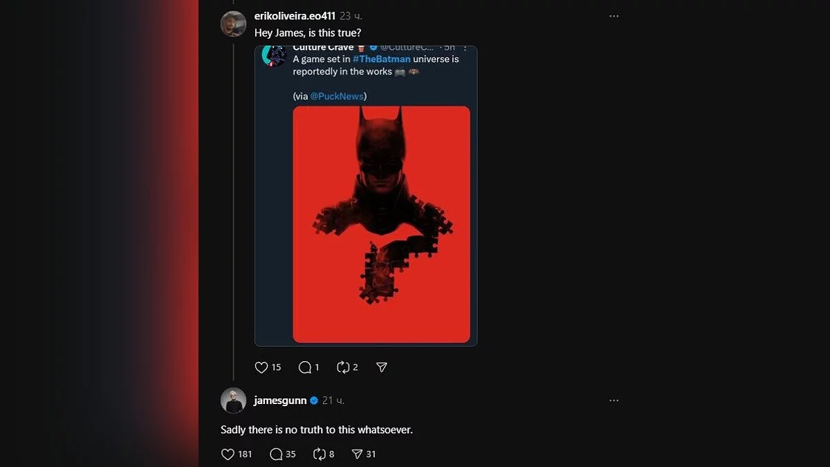 Вчера бывший журналист издания The Hollywood Reporter опубликовал статью, в которой сообщил о разработке Warner Bros. игры по мотивам «Бэтмена» режиссера Мэтта Ривза (Matt Reeves). Генеральный директор DC Studios Джеймс Ганн (James Gunn) опроверг это заявление.