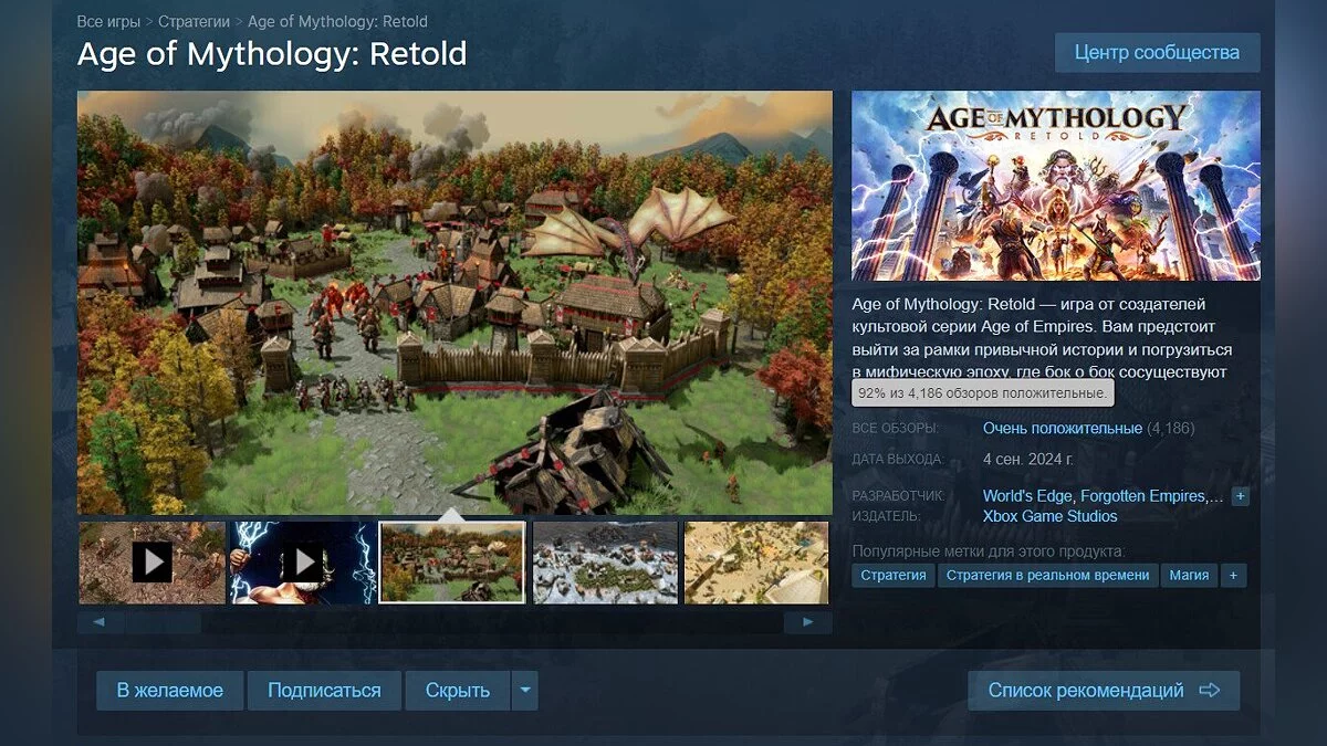 Вчера (4 сентября) состоялся полноценный релиз стратегии в реальном времени Age of Mythology: Retold, которая получила в Steam очень положительные отзывы. Рейтинг на момент написания новости составляет 92%.