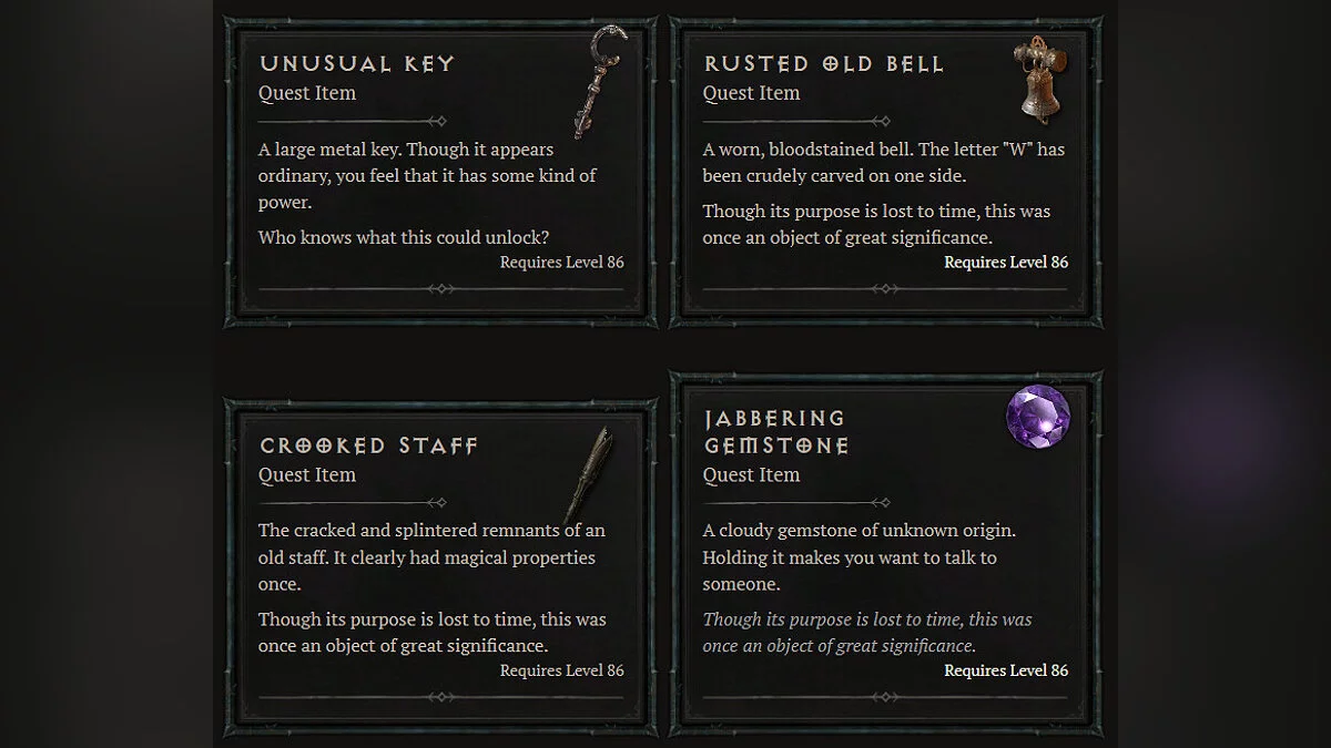 На днях игроки, похоже, продвинулись в своих поисках. Исследуя контент патча 2.0 на тестовом сервере, они обнаружили новое оружие «Ржавый бердыш» с эффектом «Запах навоза», напоминающее «Коровий бердыш» из третьей игры, который позволял открыть доступ к «коровьему уровню». Также датамайнеры обратили внимание на несколько квестовых предметов — «Необычный ключ», «Ржавый колокольчик», «Кривой посох» и «Болтливый самоцвет». Предметы с похожими названиями позволяли в Diablo 3 открыть доступ к другому секретному уровню.