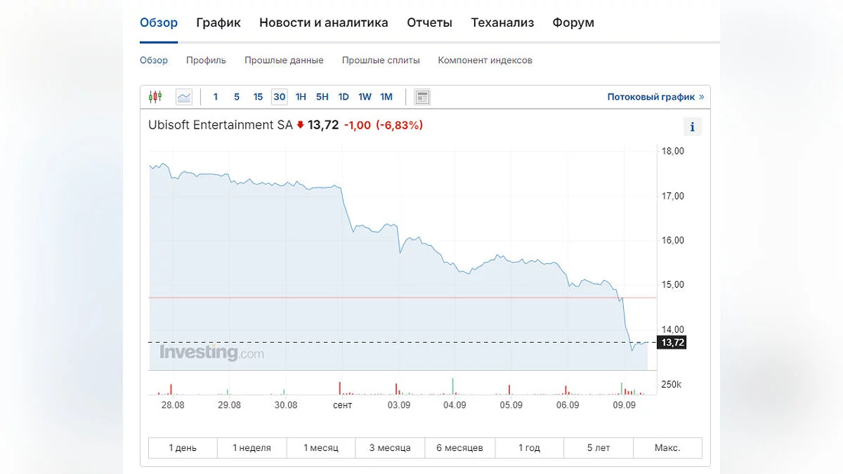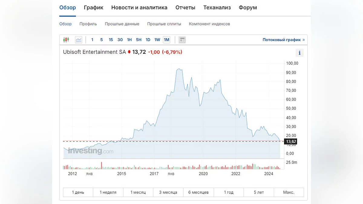 Судя по данным сервиса Investing.com, на момент релиза Star Wars Outlaws 30 августа акции Ubisoft вновь начали дешеветь, за неделю обрушившись до уровня 2014 года. По всей видимости, сказались довольно слабый старт игры и негативные оценки геймеров. Кроме того, появились плохие новости о шутере XDefiant, который растерял почти всю свою аудиторию.