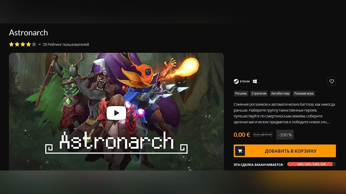 Забрать Astronarch можно в сервисе Fanatical. Для этого нужно залогиниться на сайте, привязать профиль Steam и нажать кнопку «Добавить в корзину». После этого можно будет получить ключ, который активируется в Steam. Примечательно, что геймерам из РФ может потребоваться смена геолокации для доступа к сайту, где проходит раздача игры. Акция продлится до 16 сентября или пока не закончатся ключи.