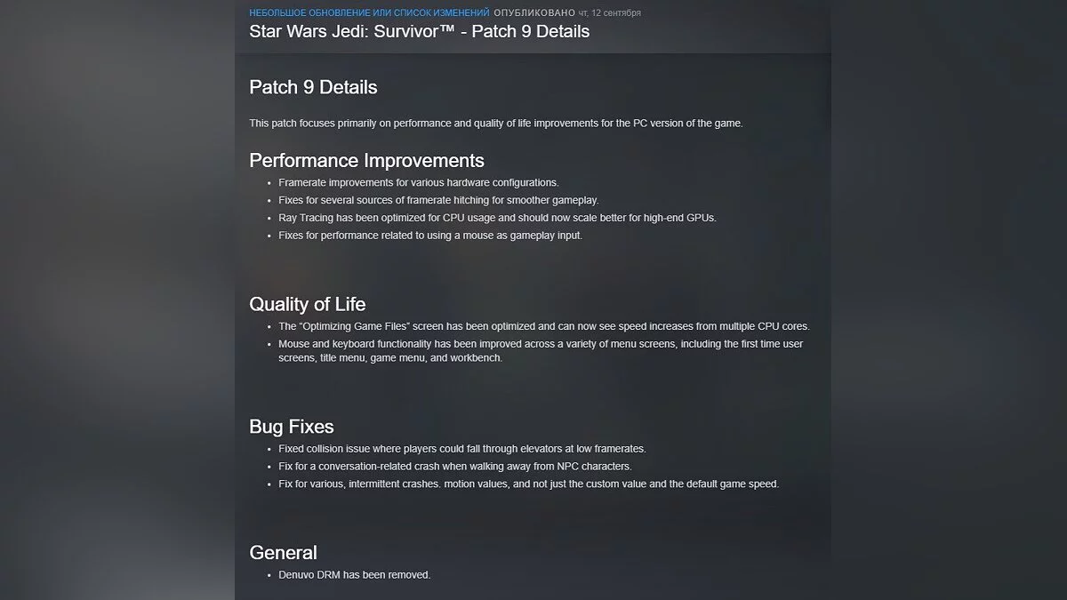 Студия Respawn выпустила очередное обновление для ПК-версии Star Wars Jedi: Survivor. Кроме прочего, патч удалил стороннюю защиту Denuvo, которая сильно влияет на производительность игры.