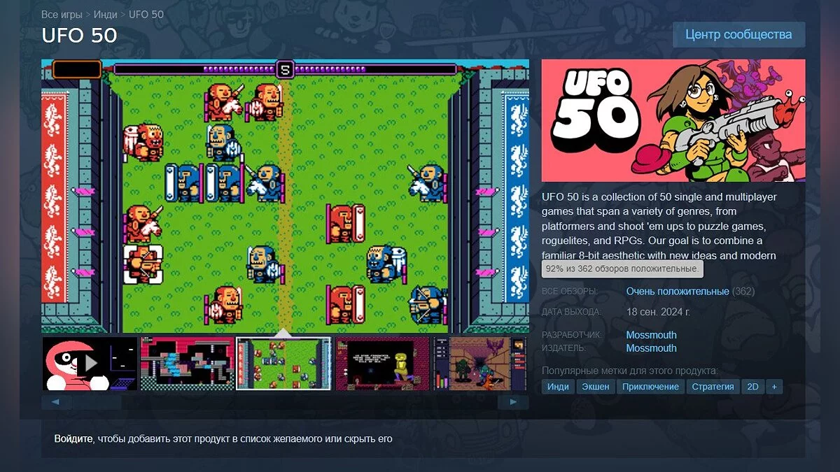 На днях в Steam состоялся релиз проекта под названием UFO 50, который был анонсирован еще семь лет назад. Рейтинг на момент написания новости составляет 92% на основе 362 пользовательских обзоров.