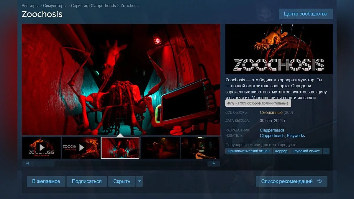 Компании Playworks и Clapperheads выпустили в Steam бодикам-хоррор Zoochosis, основное действие которого разворачивается в зоопарке с животными-мутантами. Первые отзывы — смешанные (рейтинг 46%).