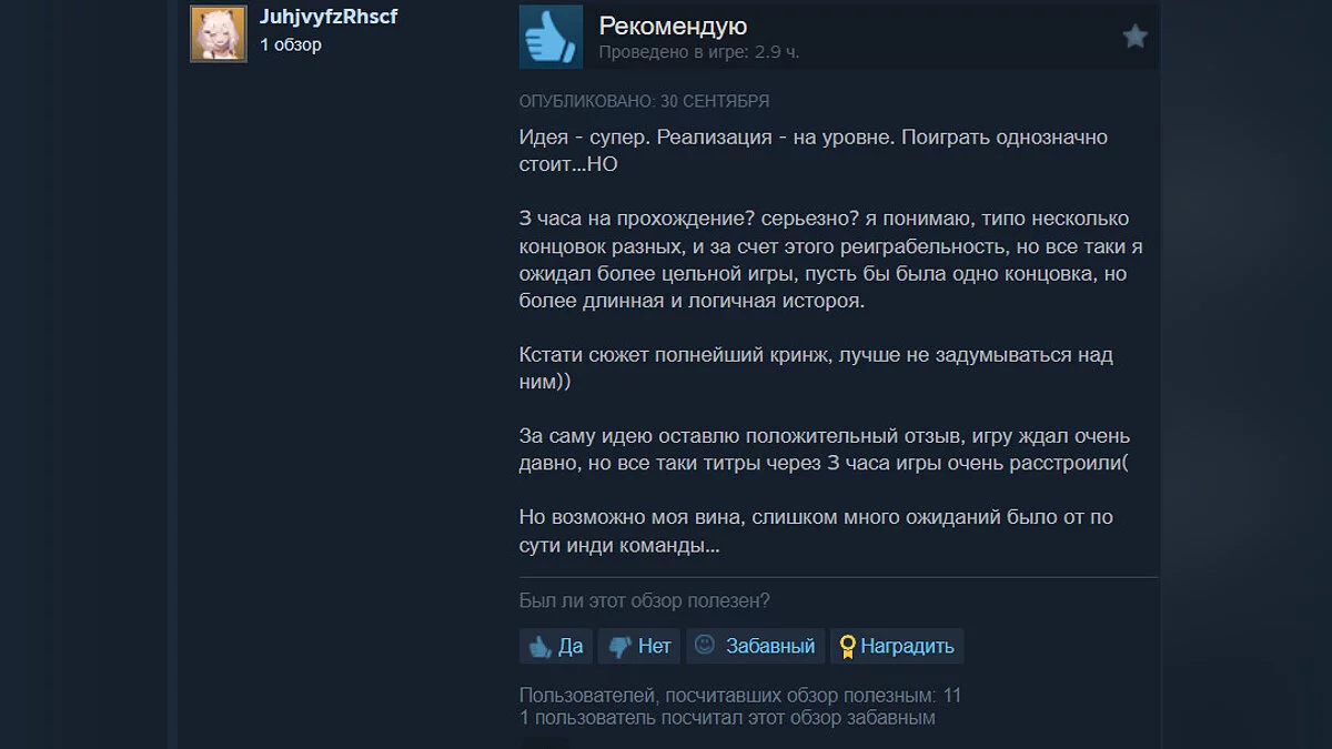 Среди особенностей выделяют несколько концовок, зависящих от принятых в ходе прохождения решений. К минусам проекта геймеры относят малую продолжительность (около 2-3 часов).