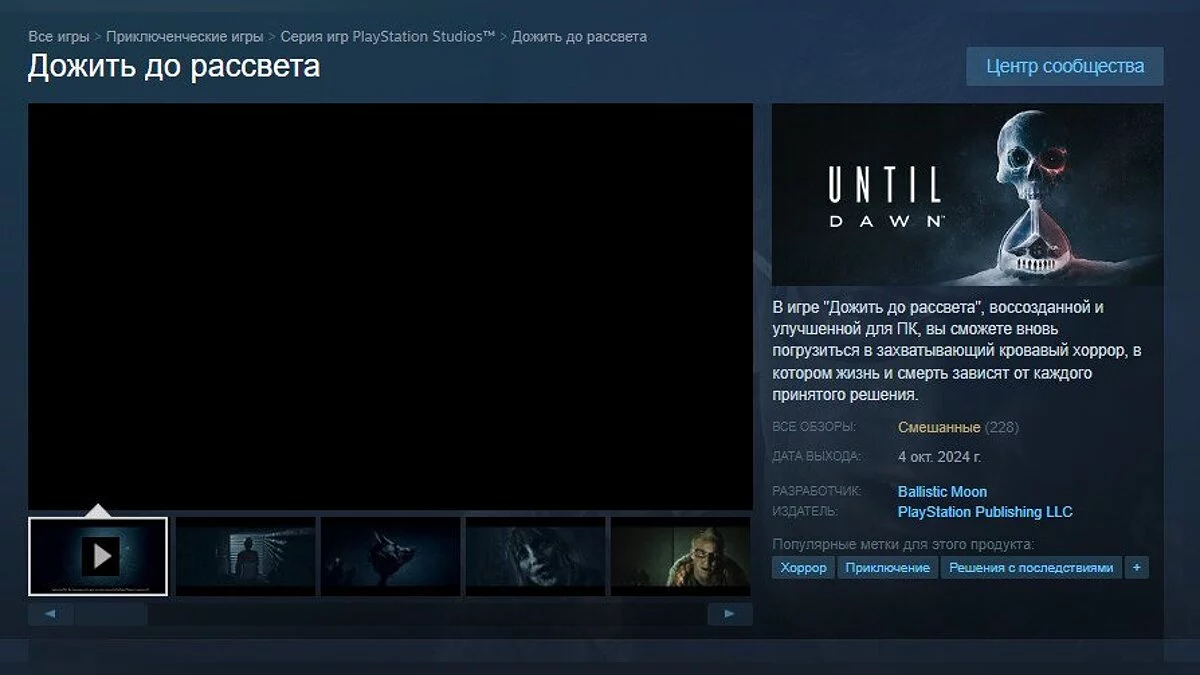 Что касается оценок в Steam, то ситуация пока удручающая. Ремейк Until Dawn получил «смешанные» оценки от игроков и рейтинг 58%. Особой популярностью у геймеров он тоже не пользуется. Судя по отзывам, в версии для PC полно багов, игра довольно плохо оптимизирована и при этом требует обязательную привязку аккаунта к PSN.