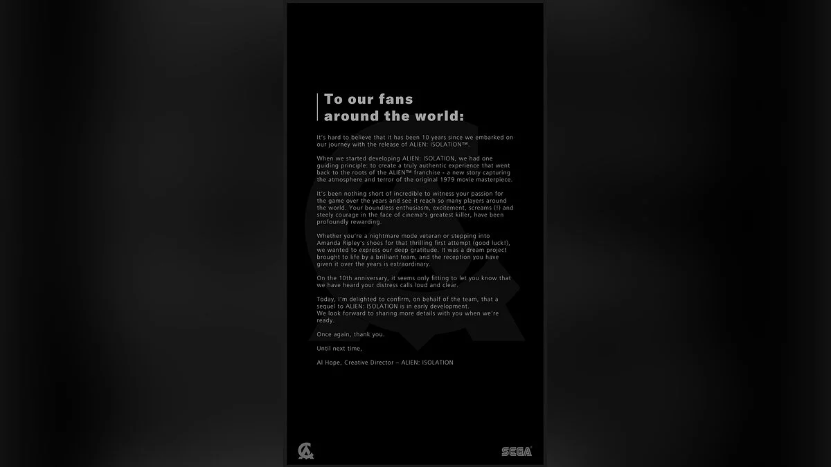 Креативный директор Alien: Isolation Эл Хоуп (Al Hope) написал обращение к фанатам в честь второго юбилея игры, в котором поблагодарили игроков за поддержку и теплый прием хоррора. После этого он официально объявил об анонсе сиквела — команда уже работает над проектом, чье существование долгое время подтверждали инсайдеры.