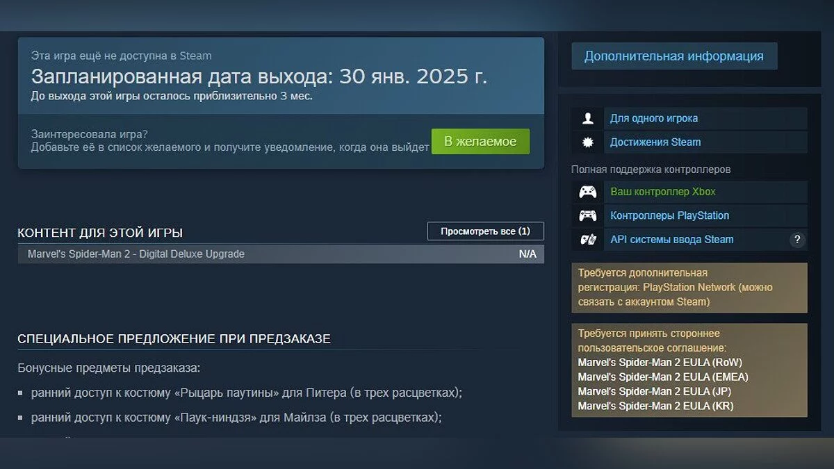Кроме того, PC-версия Marvel's Spider-Man 2 потребует привязку Steam-аккаунта к службе PlayStation Network. Поскольку PSN работает не во всех странах (включая СНГ), проект не будет продаваться в этих регионах.