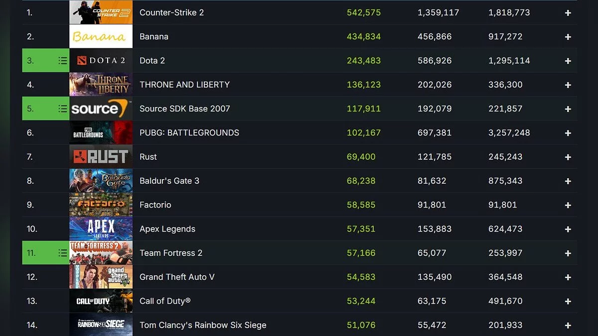Самой популярной игрой в Steam до сих пор остается Counter-Strike 2, пиковый онлайн которой составляет 1,8 млн игроков.