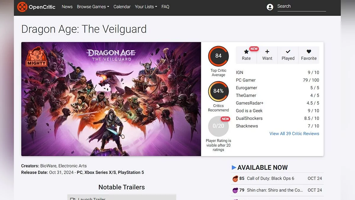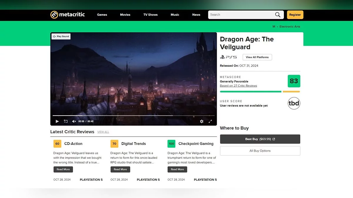 Сегодня в 18:00 по мск спало эмбарго с обзоров Dragon Age: The Veilguard, и различные зарубежные издания выставили первые оценки новой части серии. Согласно отзывам критиков, игра получила средний рейтинг 84 балла на Open Critic и 83 балла на Metacritic.