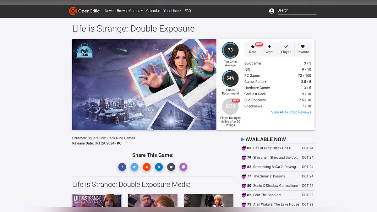 Наряду с первыми оценками Dragon Age: The Veilguard подоспели и отзывы критиков о Life is Strange: Double Exposure. Игру оценили довольно средне — 73 балла из 100 на Open Critic и 74 балла на Metacritic.
