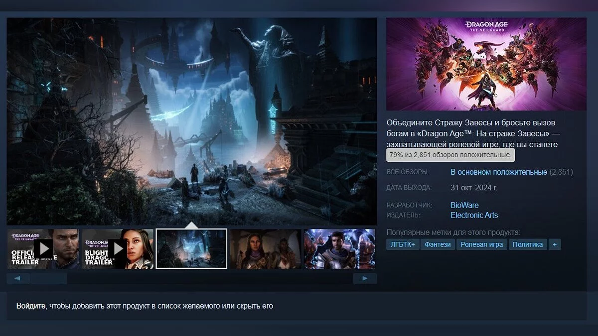Вчера (31 октября) состоялся релиз Dragon Age: The Veilguard, которая за сутки, как оказалось, получила в основном положительные отзывы от геймеров. К примеру, на момент написания новости ее рейтинг в Steam составляет 79%.