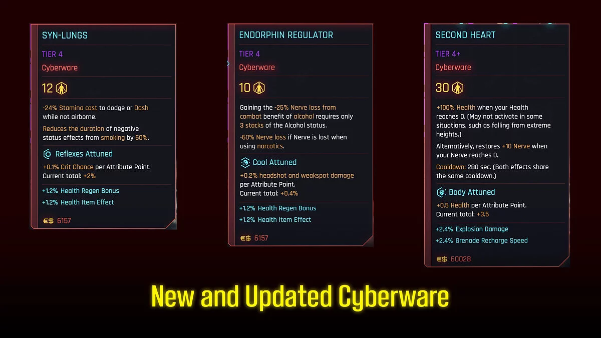 Аддон добавляет еще один показатель в игру — Nerve, который будет измерять степень стресса Ви. Во время боя или при сканировании врагом его уровень будет падать, что приведет к дрожащим рукам при прицеливании и падению выносливости, а при нулевом показателе наемник может даже получить сердечный приступ с летальным исходом. Чтобы такого не происходило, нужно следить за психологическим состоянием Ви, не забывая про приятные активности в квартирах и некоторые стимуляторы.