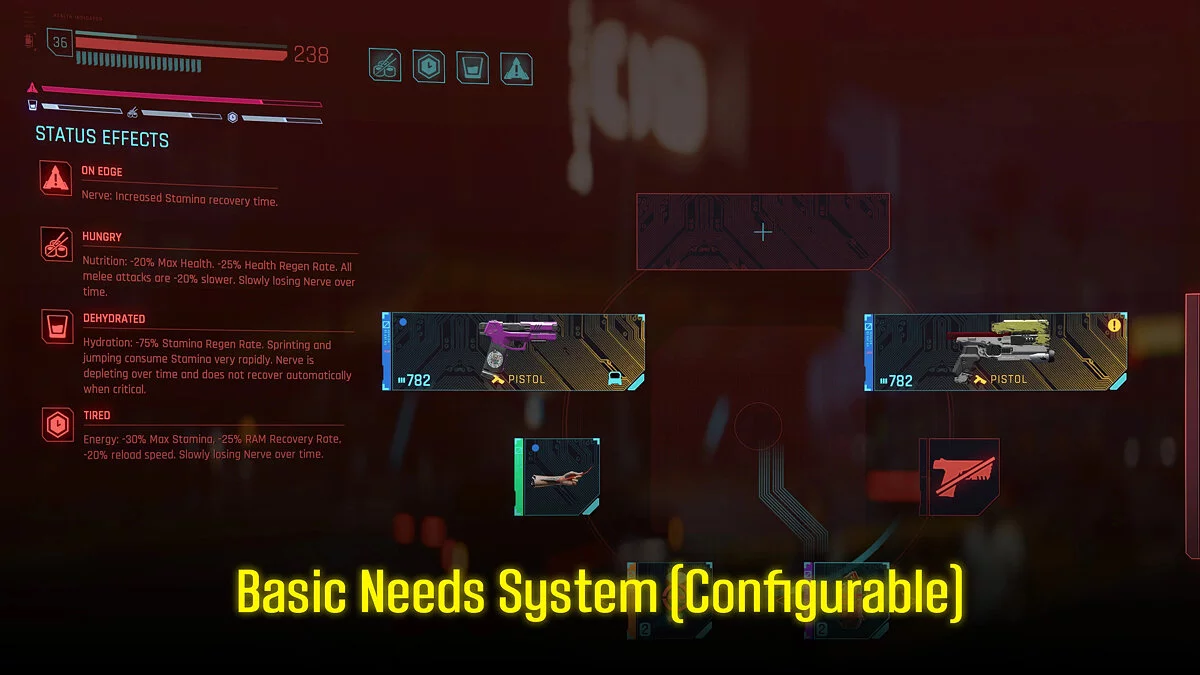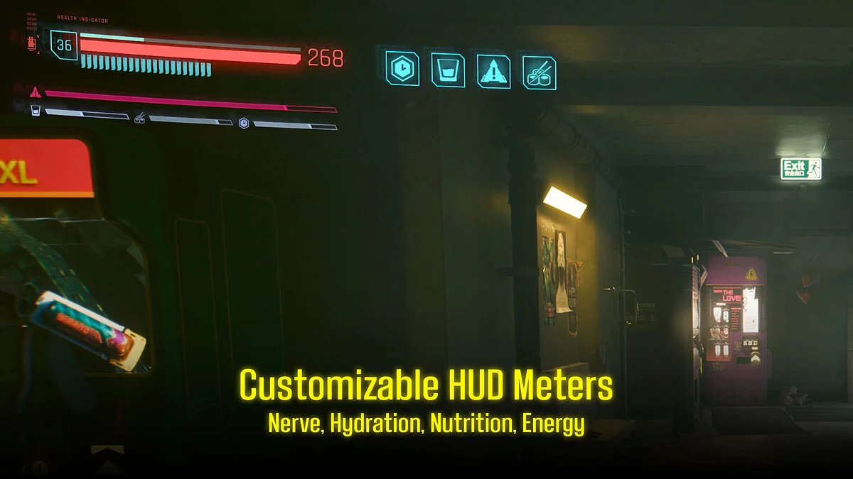 Мод Dark Future — Urban Survival Gameplay заставит игрока использовать расходники, которые в самой игре были либо простым мусором, либо лишь незначительно повышали статы. Теперь Ви нужно будет полноценно пить и есть, а также спать, чтобы эффективно развивать карьеру наемника. Квартиры станут не просто приятной покупкой и фоном для фоторежима, но местом отдыха — тусовки с романтическим интересом, душ и игра на гитаре наградят положительными баффами.