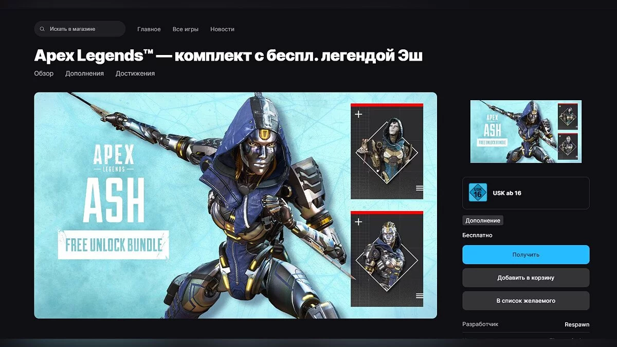 Также с раздачей можно прихватить бесплатный набор по Apex Legends, который включает в себя легенду Эш и эпический облик для нее. Раздача недоступна для России.