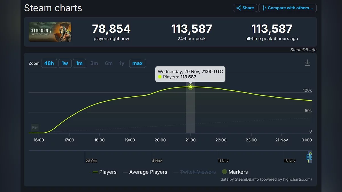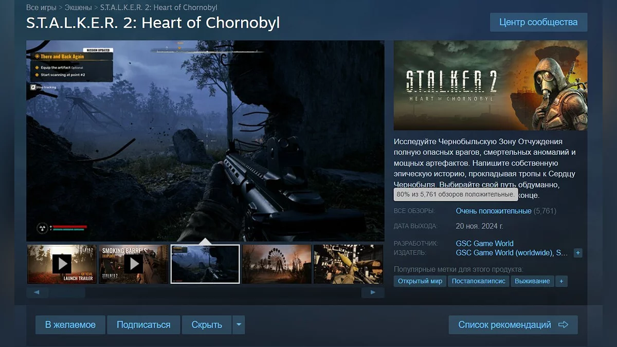 Вчера (20 ноября) состоялся релиз S.T.A.L.K.E.R. 2: Heart of Chornobyl, которая на момент написания новости имеет очень положительные отзывы от геймеров (рейтинг 80%). Кроме того, проект вошел в ТОП-10 самых популярных игр в Steam.