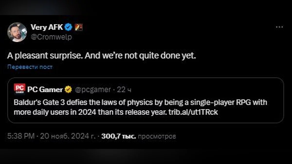 Недавно Майкл Даус (Michael Douse) рассказал, что за прошедший год среднесуточный пик одновременных подключений в Baldur's Gate 3 подрос на 3%, а ежедневное число активных игроков — на все 20%. На Steam Deck тоже все хорошо — с устройства играют на 61% больше геймеров, чем в 2023 году. Эту информацию подхватили зарубежные издания, и директор издательства решил подогреть интерес: