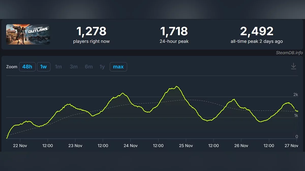 Недавно в Steam вышла Star Wars Outlaws от Ubisoft, которая получила смешанные отзывы от геймеров, а ее онлайн на момент написания новости составляет всего 1,3 тыс игроков.
