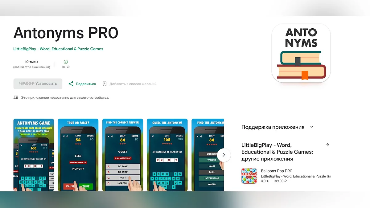 - Antonyms PRO — обучающая игра для прокачки знания английского языка, в которой игрок должен находить антонимы слов (загрузить бесплатно);